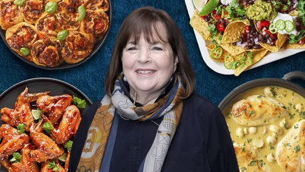When organizing a dinner party that would take place during warmer months, Garten leaps at the opportunity to host the event outside and plans her al fresco menu accordingly. Setting out guacamole and tomato feta salads allows guests to help themselves as they please. Platters of oven-fried chicken and grilled New York strip steaks can keep carnivorous friends satisfied, while salads made with farro, heirloom tomatoes, and blue cheese are sure to keep vegetarians content.