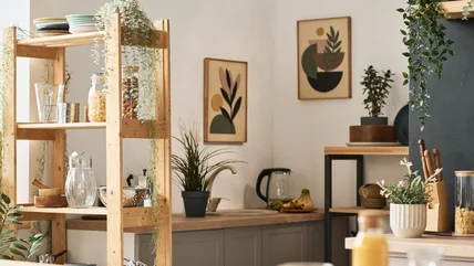 Additionally, try these British-inspired kitchen design tips to find creative solutions to storage issues, such as repurposing old furniture for kitchen storage. If you can afford to, upgrade your kitchen countertops from outdated ceramic tile or laminate to a trendier kitchen countertop option like butcher block or quartzite. If you can't afford to replace outdated countertops and flooring or don't want to paint the walls, you can cover up damaged or stained flooring with area rugs and hide fading paint by hanging your favorite photos or artwork over it.