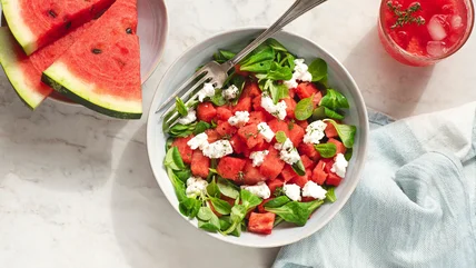 Step aside, "Watermelon sugar high." (Harry Styles fans, rise up). When warm weather strikes, we're all about "Watermelon salad high." A typical watermelon salad comprises cubed watermelon, red onion, English cucumber, lime juice, and feta cheese crumbles. Bright, refreshing watermelon salad is one of the best ways to maximize seasonal summer produce — but if you're fresh out of feta, don't trip.