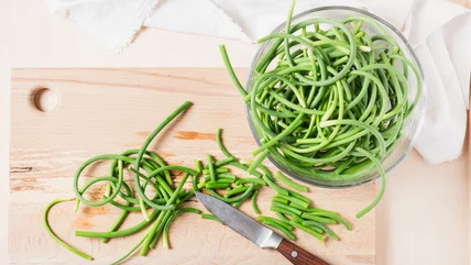 Garlic scapes pop up in late spring and early summer, the flower stems of garlic plants. Trimmed before they bloom, they have a fresh garlicky flavor with a texture and sweetness similar to other spring vegetables like green beans or asparagus. They have a short season, so you should act fast if you see garlic scapes at the grocery store or farmers' market. There's no need to freak out if it looks like you've bought (or grown) too many, as garlic scapes can be stored in the fridge for up to three weeks, and also work well pickled, kind of like garlicky dilly beans.
