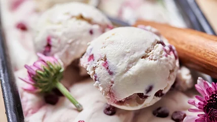 The delicate, sweet-tart flavor of pomegranate fits beautifully into a rich no-churn ice cream, transforming it into something altogether more elegant. This vanilla-flavored base features both pomegranate juice that's swirled through the mixture in the pan before everything is frozen, as well as pomegranate seeds, which are scattered on top. Feel free to decorate each pretty pink scoop with some edible flowers for a touch of whimsy.
