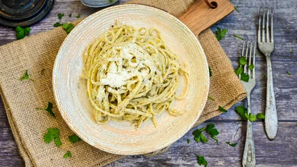 Don't want to eat meat? Look for just cacio e ova. The dish actually comes from Naples, but it has a very similar creamy taste and texture to Abruzzese agnello cacio e ova, only it contains pasta instead of lamb. There's also Abruzzese pallotte cacio e ova, but while it sounds like agnello cacio e ova, it's actually a very different dish, made with meatless meatballs and a rich tomato sauce.