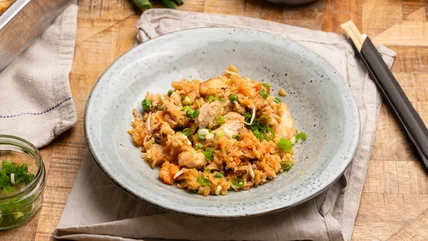 Remove the chicken fried rice from the oven and serve.