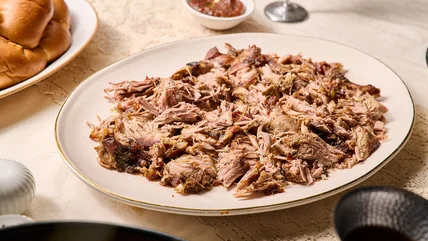 Lamb isn't a typical meat to serve shredded or pulled, and shredding lamb meat will play out a little differently than shredding a pork shoulder. The process is similar to carving a Thanksgiving turkey, which is usually carved into smaller pieces. To shred the lamb, you can use a carving fork or simply a regular fork, and pull away pieces from the lamb shoulder, removing any bones or cartilage as you carve. The best way to do this is with large, sturdy tongs or by holding a second fork in the other hand to secure the lamb. The lamb, which cooks for nearly 4 hours, should pull away easily from the bone, but will be leaner and more resistant than pork.