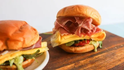 Forget the bacon and upgrade your sandwich to include prosciutto instead. The fatty, rich meat complements the folded eggs well, and the additions of pesto aioli, tomatoes, and arugula make for a fresher breakfast sandwich than most. Sure, it's a little messy once you start working with the aioli, but the mess is absolutely worth it when you taste how amazing this sandwich is. Just don't eat it in the car or when you're on the go ... it's prone to dripping.