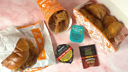 First up is the Popeyes x Hot Ones mildest offering in the lineup, its Sizzlin' Sriracha Dippers. The chicken dippers are marinated in pickled garlic sriracha, and served with both a buttermilk ranch cup and a packet of sriracha. I mixed some of the sriracha and buttermilk ranch to get the full experience before digging in (and, admittedly, I appreciated the ranch to help cool my tongue).