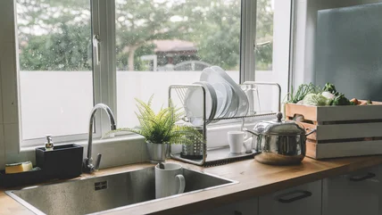 If you look at expert decluttering tips, like Martha Stewart's ideal way to organize a kitchen, you'll find that optimizing this room requires a balance of flow, space, and accessibility. Storing your dish rack on the counter right next to the sink is convenient but bulky. It can take up a lot of valuable counter space, disrupt the clean visual flow of kitchen surfaces, and may become unsanitary if lots of water accumulates on the counter under the wet dishes. On the other hand, hanging a dish-draining rack just above eye level over the sink is a space-efficient solution that's still easy to reach. Overhead draining racks reduce eye-level clutter and keep your counters neat. Plus, wet plates and bowls can breathe, drain, and dry easily above the sink where they're not fighting for counter space.