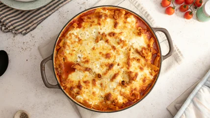 The name "ziti" comes from the Italian "maccheroni della zita," which means "bride's pasta." Baked ziti is a dish that is often served and enjoyed on special occasions, most notably at wedding celebrations, and can often incorporate a wide range of different ingredients from eggplants to pancetta, depending on the particular family, town, or region. If you are having a hard time getting your hands on ziti pasta, rigatoni or penne can also be used in this recipe to great success, but if possible, we recommend reaching for the ziti to maximize your pasta bake experience.