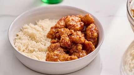 Though this recipe is designed to be made with few ingredients and in less than 20 minutes, you can always make the chicken from scratch by frying the pieces yourself. To do this, first slice boneless chicken thighs into bite-sized pieces. First dredge the chicken in flour, then coat with beaten egg and dredge again in flour, baking powder, cornstarch, and salt. Heat a pot of oil over medium heat, and once hot, fry the chicken pieces until browned and crispy. You can take it a step further by marinating the chicken first in soy sauce and Shaoxing wine, infusing it with more flavor before frying.