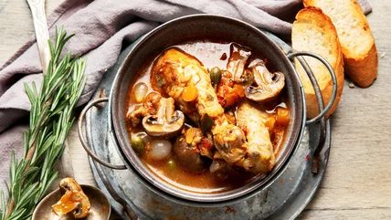 With your pearl onion prep work simplified, you can now focus on other essential tips for a perfect coq au vin. For the best results, stick to chicken thighs or bone-in legs to prevent the meat from drying out. For extra meatiness, some preparations add lardons or pancetta into the mix, as well. We also recommend reducing the wine before making coq au vin for a deeper, more richly concentrated flavor in your sauce. Happily, leftovers of this wine-braised chicken hold up well and taste even better the next day. Pair 'em with crusty French baguette slices and herbaceous compound butter to complete the meal, plus a glass of the same red Burgundy wine you used to make the dish.