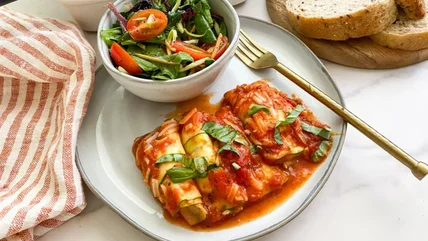 In order to make the dish so enriching, Hahn uses the largest zucchinis to ensure each strip is wide. The zucchini doesn't require any cooking beforehand — just peel them into thin strips and swipe cream cheese onto them before rolling them up. Once each roll is assembled in a baking dish, layer pasta sauce and mozzarella on top and bake for 20 minutes at 350 degrees Fahrenheit.