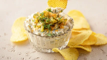 Classic, eponymous Southern beau monde dip includes some mixture of sour cream, mayonnaise, grated onion, fresh parsley and dill, plus a generous pinch of Beau Monde, the star ingredient. This popping celery-onion dip is served chilled, customarily with potato chips or raw crudité veggies – salty, rich, and just a tad sweet. The jarred store-bought product is available at grocery retailers, especially in the South, but is also simple to mix up at home using a combination of spice rack staples: celery seed, onion powder, table salt, garlic powder, and a pinch of granulated sugar. Store the seasoning blend in an airtight container away from direct sunlight.