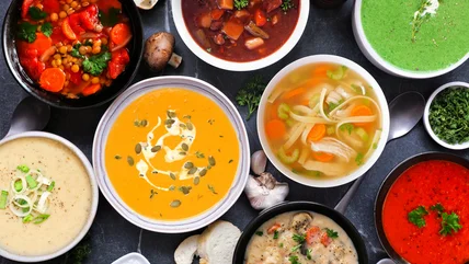 Made with a rich blend of squash and root veggies, the soup calls for carrots, potatoes, butternut squash, an onion, and a leek. Simmered with vegetable stock and tenderized before blending into a velvety smooth soup and seasoned with salt and pepper, this soup requires only basic ingredients and minimal effort to come together for a perfect bowl. The lovely golden hue and pleasing texture open up a variety of possibilities for other additions and complementary dishes to build a full fall feast.