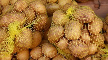 Breathable bags are one of the top things to look for when buying the freshest potatoes because mold grows most easily in humid environments. Ventilated storage vessels help moisture evaporate, keeping the spuds fresh and dry. Plus, potatoes both emit and are sensitive to ethylene gas, a compound that causes produce to age after picking. If the bag they're stored in doesn't allow that gas to escape, the taters are on the fast track to sprouting and turning soft.
