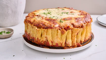 If you do not have a springform pan or the pasta seems to be falling apart, you can also serve the honeycomb pasta from inside the pan. Because the noodles fall as soon as the pasta is served, this won't be as visually stunning — but it is the cleaner method, with all of the sauce and cheese staying within the walls of the pan. To serve the pasta this way, simply dig into the pasta bake like any casserole, with a big spoon to catch saucy drippings.