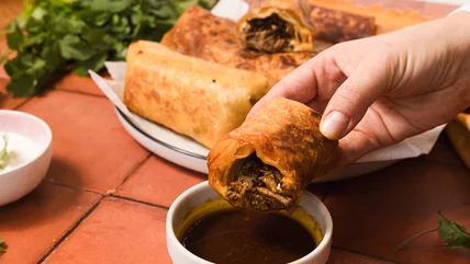 The result of this crossover is crispy rolled-up packages that explode with flavor as you bite into them, revealing a soft, fragrant, and deeply seasoned shredded beef filling. The wrapping crackles, the meat melts in your mouth, and the cheese punctuates everything with a creamy finish. If that's not the perfect Tex-Mex dish, we truly don't know what is.