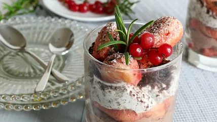 To make this Italian dessert, ladyfingers are traditionally soaked in alchermes liqueur and placed into the bottom of a dish or bowl before custard cream is spread on top of the boozy pieces. After several alternate layers have been stacked, this sweet structure is finished with one last slather of custard cream and a crowning of whipped cream. Once this treat is assembled, the stack is left to chill for several hours and can be garnished with fruit or chocolate shavings just prior to serving. The presentation resembles an English trifle, and though we can't be exactly sure where this dessert initially came from, Italians lay strong claim.