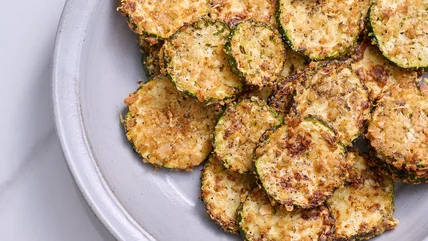 Zucchini is a versatile vegetable that's great for roasting, frying, boiling, and sauteing. When coated in breadcrumbs and cheese, zucchini slices become bite-sized snacks full of vitamins and minerals without compromising any flavor. Way better than french fries or potato chips, these zucchini chips offer a fun, healthy solution to dinnertime sides. This 3-ingredient air fryer zucchini chip recipe, written with developer Michelle McGlinn, is an easy way to make zucchini chips fast, and with only a few ingredients — meaning you can have the healthy, delicious side dish or snack at any time.