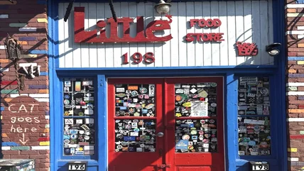 On Carroll Street in Atlanta's Cabbagetown neighborhood, situated along a colorful block, a giant stuffed bunny sits atop a spider with a human skull for a face, suspended above a wooden sign with red lettering that reads "Little's Food Store." Stickers cover the windows of the shop's double doors, and to the left of the entrance, inscribed on its brick exterior, are the words "CAT goes here," with a downward-pointing arrow gesturing towards a newspaper stand (also sheathed in stickers). Little's has stayed true to this idiosyncratic style for decades.