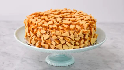 Coffee crunch cake began as the innovative rescue mission of master baker and Le Cordon Blue-trained pastry chef Ernest Weil. Per the lore, after a bakery employee accidentally overboiled a batch of Blum's (supposed-to-be) soft coffee candy, Weil leapt into a thrifty effort not to waste it. The pastry chef broke the crispy, honeycombed sugar candy into small pieces and added it to Blum's regular sponge cake. The result was a light, fluffy, lemon-tinged chiffon cake dotted with crunchy textural morsels. Over time, the West Coast classic was refined into a dimensional, decadent, two-layer treat covered in bittersweet frosting. To assemble, the chiffon cake gets allover-frosted in a coffee-flavored whipped cream infused with vanilla and instant coffee granules, and sprinkled with a generous coating of the shattered coffee candy pieces. A center layer of candy shards (a combination of sugar, strongly-brewed coffee, corn syrup) gives this cake the "coffee crunch" factor in its name, and it quickly emerged as a signature sweet of the city.