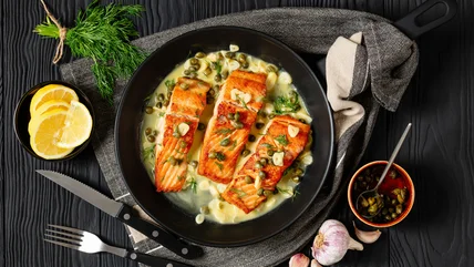 Simple seasonings always do the trick, but feel free to brine the fish beforehand for an even more thorough flavor. Then, sear the fillets until both sides are golden brown before taking them off the heat. This should only take a few minutes. Make the sauce as usual, and once it's nearly done simmering, return the salmon to the pan. This is when it continues cooking to your desired level of doneness.