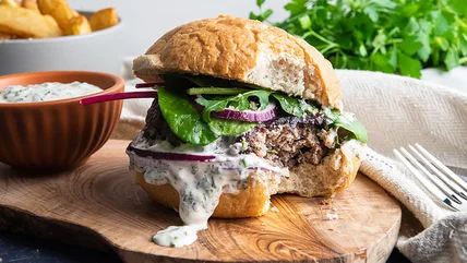 A juicy homemade burger always makes for a satisfying dinner, and this mint-infused, lamb-based creation is a must-try. To the minced lamb shoulder, we add a moreish medley of onion, garlic, and herbs, shaping the mixture into patties and grilling these until delightfully charred. The creamy, garlicky sauce is bursting with flavor too, further enhancing the fresh profile with more mint, plus peppery parsley and citrusy dill. The final stack hits all the right notes, with the succulent meat, rich sauce, crunchy salad veggies, and warm toasted bun all complementing each other brilliantly.