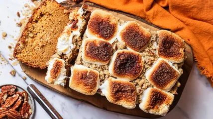 Enjoy your favorite holiday side in dessert form with our moist, sweet-spiced sweet potato pound cake with toasted marshmallow and pecan crumble topping.