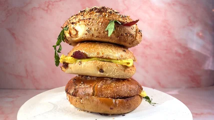 The Wake-Up BLT Asiago Everything Bagel Stack is the most unique of the offerings. The chain's new Asiago Everything Bagel is featured, inside of which is tomato, arugula, scrambled egg, applewood smoked bacon, salt and pepper, and a cheesy Benedict sauce. Up next is the Farmhouse Duo Asiago Bagel Stack, which puts applewood smoked bacon, sausage, scrambled eggs, salt and pepper, and the same cheesy Benedict sauce on an Asiago bagel. Last but not least, the Sausage & Egg Asiago Bagel Stack contains sausage, scrambled egg, melted American cheese, salt and pepper, and a garlic aioli sauce, all on an Asiago bagel.