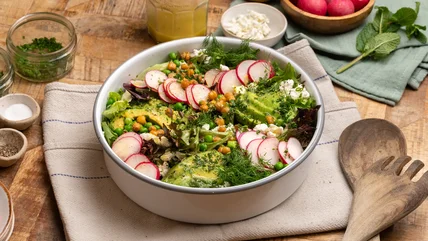 - Assemble the salad by placing the mixed greens in a large serving bowl. Top with the sliced avocado, sliced radishes, crumbled feta, peas, and chickpeas.