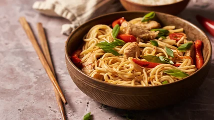 For a taste of your favorite Chinese takeout without forking out the big bucks, just whip up this easy garlic chicken lo mein from the comfort of your own kitchen. It brings all of the bold, Asian-inspired flavor you'd expect, offering the fiery kick of Fresno chili, fragrant zing of ginger, and umami depth of soy sauce. Tender noodles serve as the ultimate satisfying base, and veggies like carrots and snow peas add color and crunch. The result is a filling, complete meal that'll taste great cold the next day too.