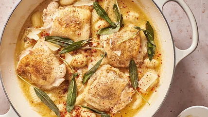 At first glance, you'd never know this hearty chicken dinner was spiked with miso, and the paste makes for a truly transformative add-in. White miso is incorporated into a rich, buttery sauce with onion, garlic, mirin, and chicken broth. This robust mixture is an exceptional match for seared chicken thighs, pillowy gnocchi, and crisp fried sage leaves. The resulting dish offers the perfect balance of elegance and rustic charm, and will taste even more special with a final sprinkling of grated Parmesan.