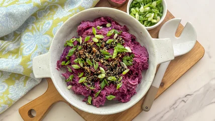 These vibrant mashed purple sweet potatoes come infused with a miso-maple sauce and topped off with a salty, subtly spicy sesame crunch.
