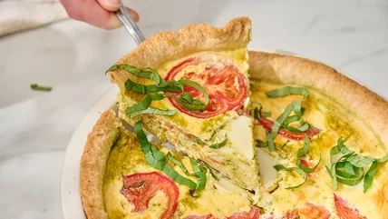 This caprese-inspired quiche recipe features staple ingredients of the beloved Italian salad, including mozzarella, tomatoes, and fresh basil.