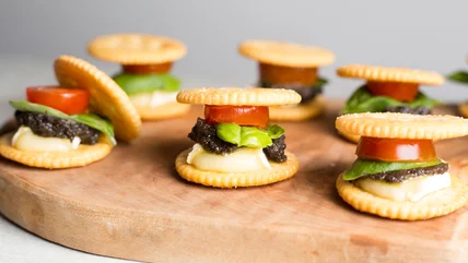 Recipe developer Michelle Bottalico has created an easy recipe for a twist on the Ritz cracker sandwich: Mediterranean Brie cracker sandwich bites. "When thinking of fillings, I immediately thought of a Mediterranean theme," Bottalico shares. "In Italy I tasted delicious sandwiches with olive pâté and Brie, which were warmed in the oven so the bread toasted and the cheese melted. I also had bruschetta with olive pâté and sliced tomato. I used these as inspiration for this recipe."
