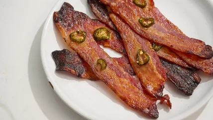 - Brush the jalapeño simple syrup across each slice of bacon.