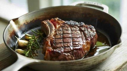 The recommended internal temperature for safe consumption of a cooked steak is 145 degrees Fahrenheit, and reaching this will vary by the thickness of your steak. Keeping this in mind, cooking a ribeye can be fairly quick, with an average of about five minutes per side. While the steak is in the pan, your seasoning should be timely and gentle for the very best taste. Serve this up with your favorite sides for a well-rounded meal.