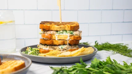 This grilled salmon sandwich couldn't be further from a sad office lunch. It was inspired by the flavors of coastal New England, from the lobster shacks of Rhode Island, to the seafood and potatoes of Maine, and even the zesty, mayonnaise-kissed chicken salads of Boston. We wanted to combine it all into one cohesive seafood salad and serve it with pizzazz.