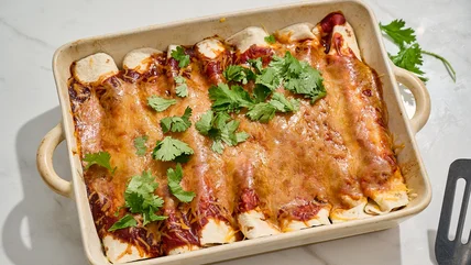 Every home cook should have a good enchilada recipe (or several enchilada recipes) in their repertoire. Easy to make and double for a crowd, enchiladas are perfect for any occasion, be it a quick and easy weeknight meal or a more elaborate weekend affair. The soft rolled tortillas can be stuffed with virtually anything, be it ground beef, pulled chicken, or even soft, cooked pumpkin puree. That's why enchiladas also make such a good vegetarian and vegan option — there are endless possibilities of meatless fillings to roll inside each tortilla.