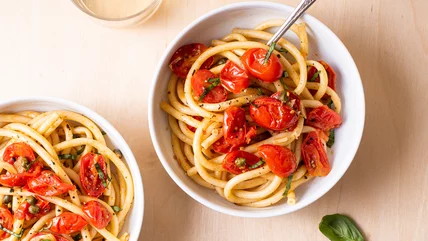 To make this recipe, you'll need bucatini, grape or cherry tomatoes, garlic, capers, dried oregano, some chili flakes, extra-virgin olive oil, and fresh basil.
