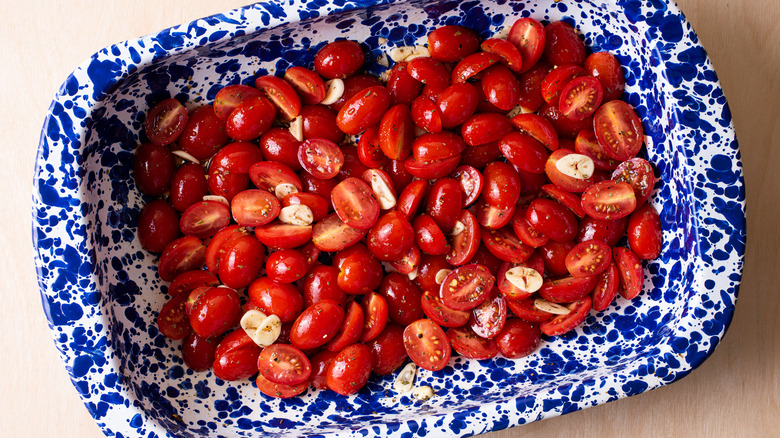 To start this recipe, preheat your oven to 350 degrees Fahrenheit. Next, halve the tomatoes and put them in a large roasting pan. Add the olive oil, thinly sliced garlic, oregano, chili flakes, salt, and pepper. Toss everything so the tomatoes are evenly coated, and pop them into the oven for about 40 minutes, tossing them halfway.
