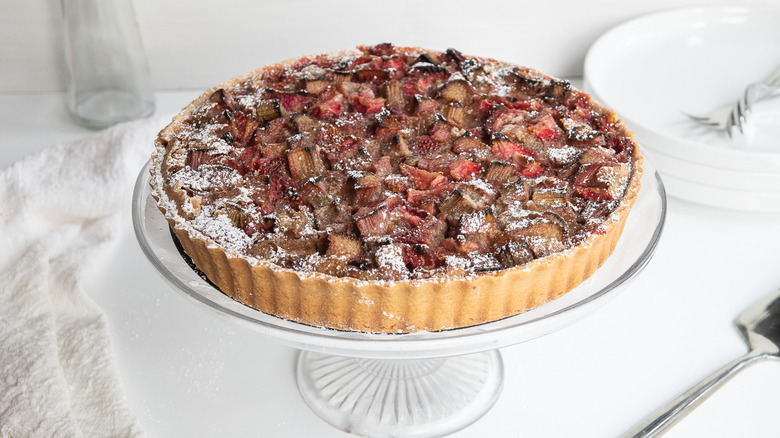 - Pour the egg mixture into the strawberry and rhubarb mixture and combine. Then pour the mixture into the prepared pastry base.