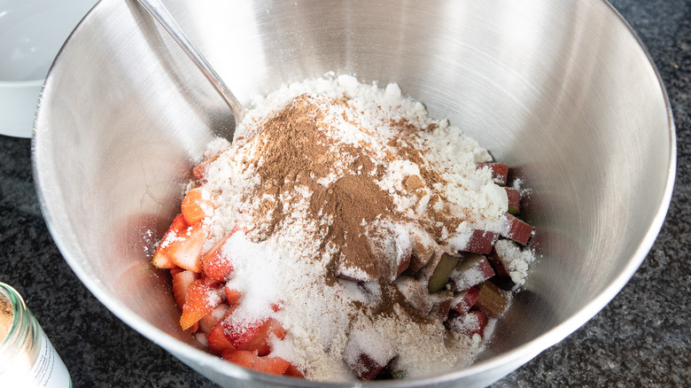 After the strawberry and rhubarb, you can also add the sugar, flour, nutmeg, and cinnamon into the bowl.