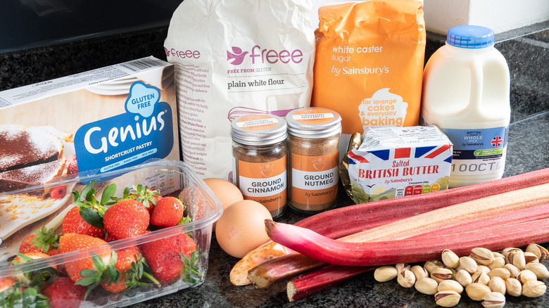 To kick things off, make a list of all of the necessary items that you will need to throw this dessert together. Start with a packet of ready-rolled shortcrust pastry, which really makes things easy as pie. You will also need some strawberries, rhubarb, and sugar. To go with the baking theme, grab some flour (Bryant uses gluten-free flour, but you can also use all-purpose flour). From the spice aisle, you will need to grab nutmeg and cinnamon.