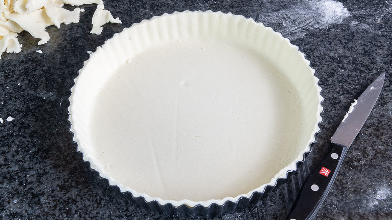 Next, grab a round 9-inch tart tin and your ready-rolled shortcrust pastry. Place the pastry in the middle of the tin and seal in the sides gently by pressing the edges of the dish with your finger. Now, it should start looking more like a tart crust. You can use a knife to cut off any extra pastry dough and then discard it unless you want to keep it to use for something later. We'll be honest, this part of the recipe is kind of relaxing because you're just working dough with your fingers.