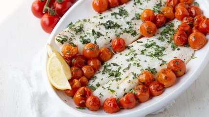 For this easy orange roughy recipe that serves four, you'll need a pound and a half of orange roughy, which will probably be about two fillets. You will also need two pints of cherry tomatoes (about 4 cups), 3 tablespoons of olive oil (divided in half), 1 teaspoon of salt (divided in half), ¼ teaspoon of pepper (divided in half), and 3 tablespoons of chopped fresh herbs. For the chopped herbs, Shungu suggests basil, parsley, oregano, and/or thyme, in any combination thereof. Also, Shungu points out that you should feel free to use frozen orange roughy fillets, but to avoid a mushy finished product, you'll want to fully defrost them first and pat them dry with a paper towel to remove any excess water.