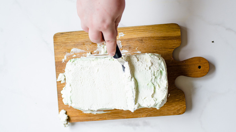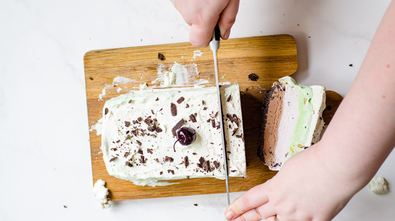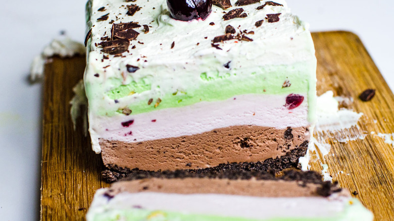 Ryan tells us to "Whip out this cake for when you have the chance to enjoy the 'oohs and ahhs.'" Spumoni can be hard to find in stores and even at Italian restaurants, so "it feels that much more special. It makes a great treat for a birthday, a cookout, or for company." Ryan shared with us that "Spumoni is my husband's favorite ice cream, so any time that I make this it is like he's a little kid at his birthday party all over again. He gets so excited for it that he hypes up all three of our kids, and now when they hear I'm making it they don't stop talking about it for the two days it takes to put it together."