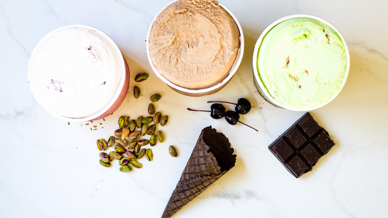 "It also is less likely to get freezer burnt as there is less water content to freeze. This is something to be aware of if you choose to do dairy-free ice cream as well. Also, the pistachio is really hard to find in anything other than standard, full-fat form," she explains.