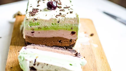 This DIY ice cream cake combines the traditional Italian spumoni flavors of chocolate, cherry, and pistachio ice creams in a delightful frozen treat.