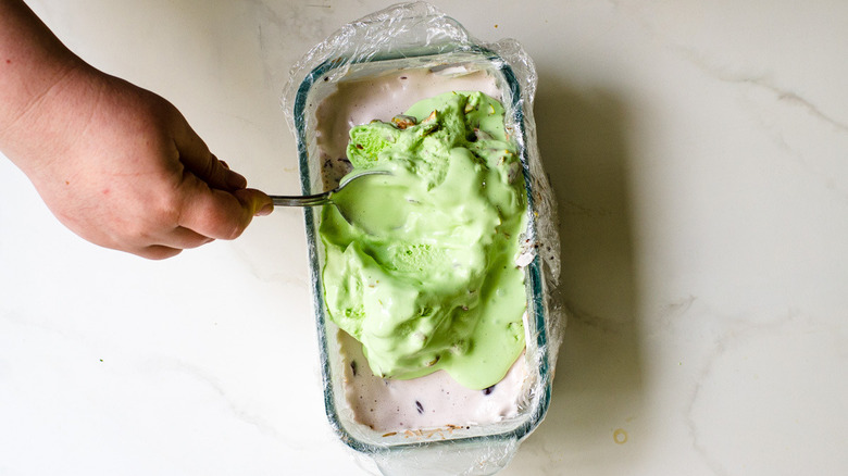 - If using, stir the optional chopped pistachios into the pistachio ice cream. Spread the ice cream in a layer over the cherry ice cream. Cover the loaf pan and freeze overnight.