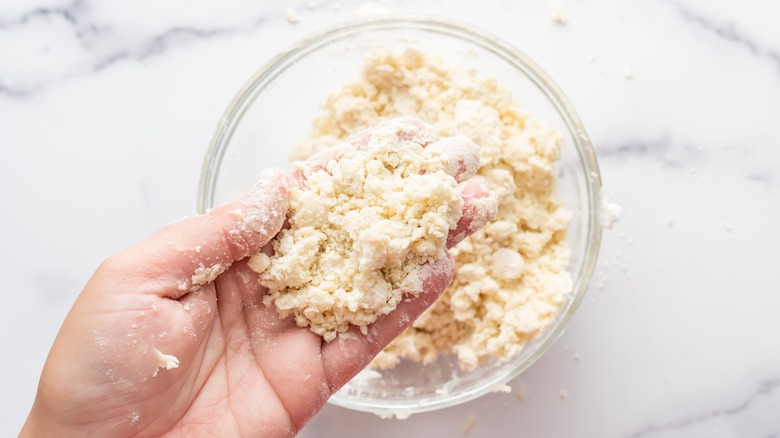 To make the batter, you want to start by combining the flour, baking powder, and shortening (or suet) in a large bowl. Use your fingers to crumble the shortening into the flour, working to incorporate the two until the mixture is uniformly crumbly and is free of large clumps. While this is indeed a messy process, it's important to use your fingers rather than a spoon to combine the shortening and flour together, since it'll be very difficult to achieve the desired texture without getting your hands a little grubby.